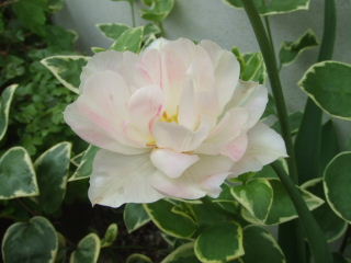 斑入りのツルニチニチソウの中に咲いたチューリップ・アンジェリケ。毎年咲く品種のようです。