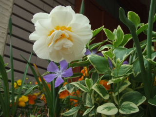 玄関脇のパンジーとツルニチニチソウのコンテナから、八重の水仙が咲きました。