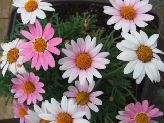 品種不明のマーガレット。開花した時はピンクで時間が経つと白くなります。