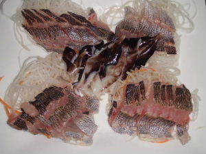 長崎産のイサキとトリ貝のお刺身。イサキは今が旬なんですって。スズキの味ににてるかな。トリ貝はくせがなく、どちらもおいしかった。